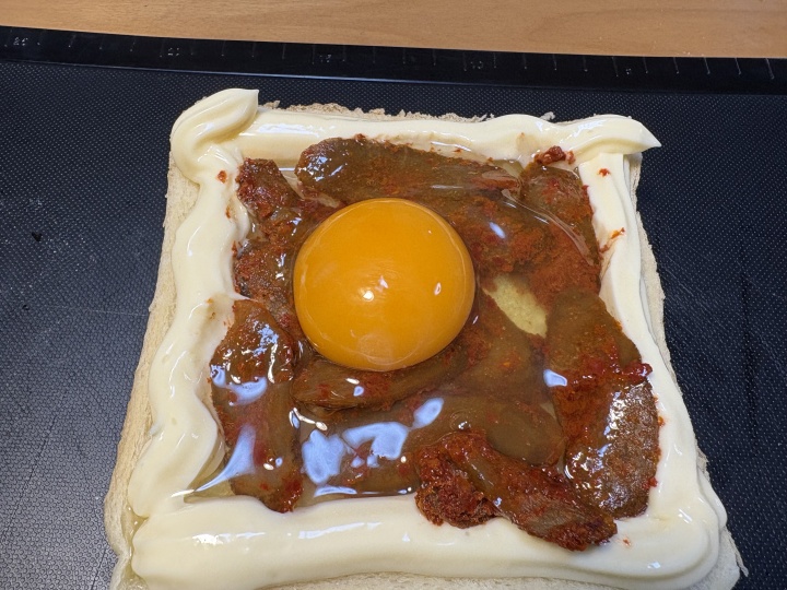 中にごぼうキムチを置き、玉子を乗せる。