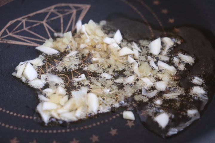 フライパンにごま油を熱し、刻んだ生姜と刻みにんにくを入れて香りを出す
