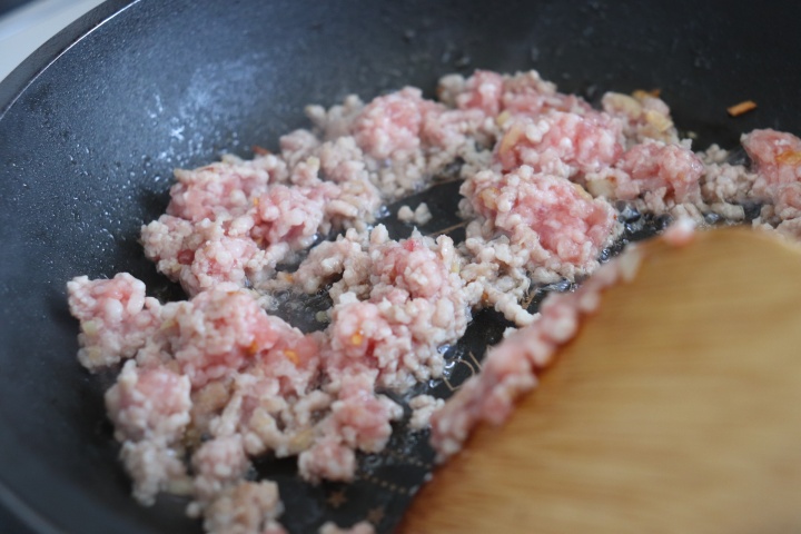 豚ひき肉を入れて木ベラでほぐしながら炒める。