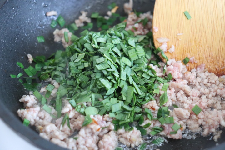 豚肉に火が通ったら、刻んだニラを加えて炒める