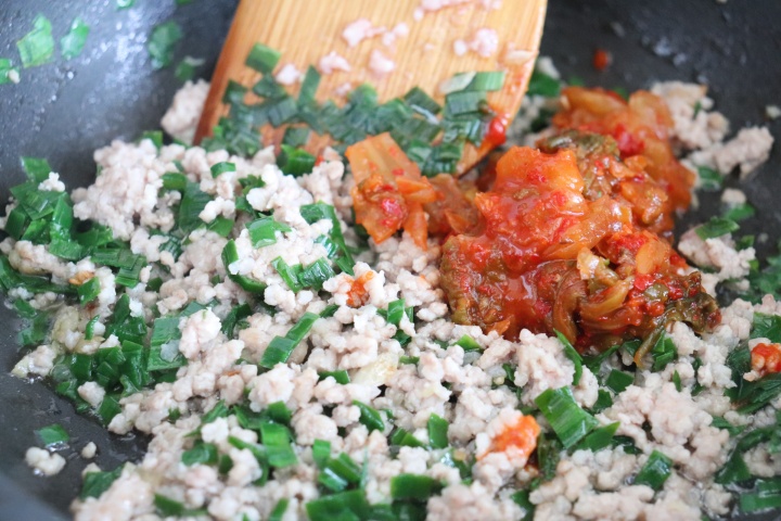 火を止めて、細かく刻んだ白菜キムチと味噌を入れて、全体を混ぜる。