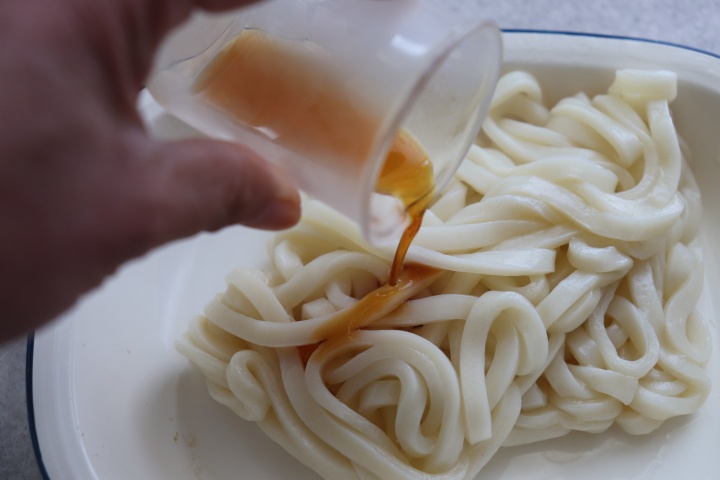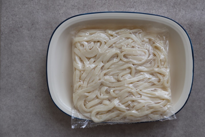 ゆでうどんの袋に少し切り込みを入れ、電子レンジ(600W)で2分半加熱する
