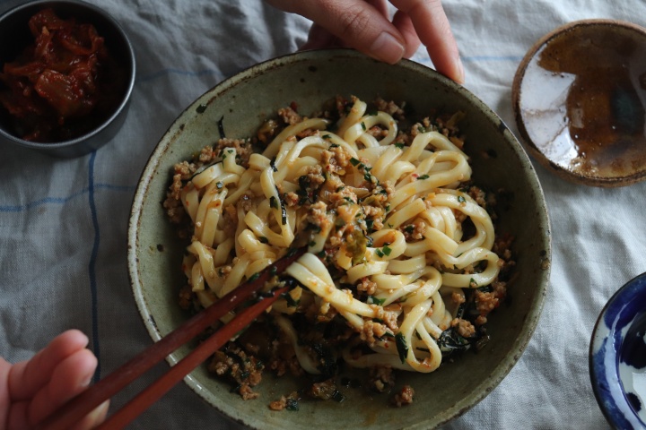 豚ひき肉を香味野菜で炒めたらキムチと同じ発酵食品の味噌で味付け。