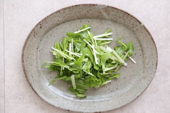 水菜は洗ってザルにあげ、食べやすい大きさに切って皿に盛る