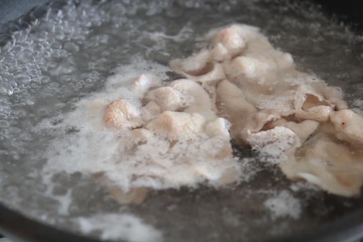 鍋(またはフライパン)に湯を沸かし、酒小さじ1(分量外)を入れ、沸騰したら豚肉を広げながら火を通す。