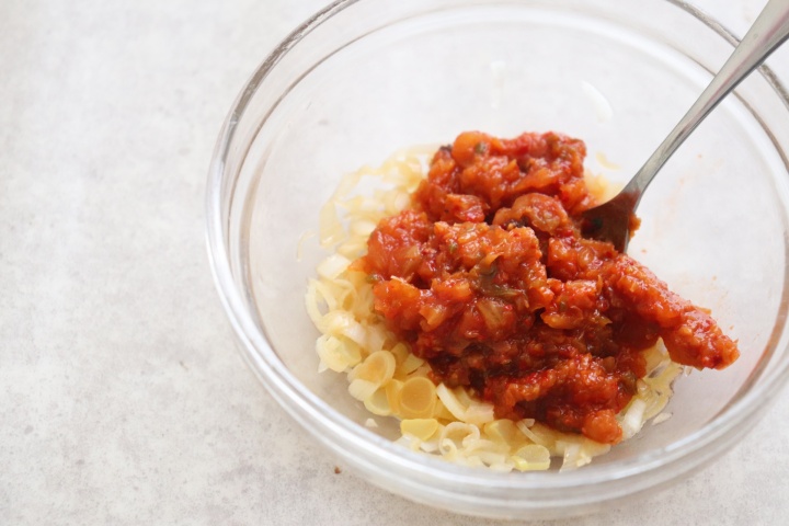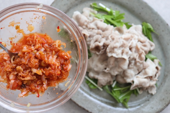 電子レンジで温めたネギダレは、冷ましてから、刻んだ白菜キムチと和えると良いです。