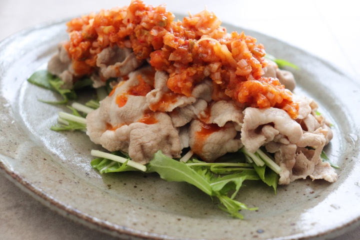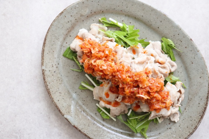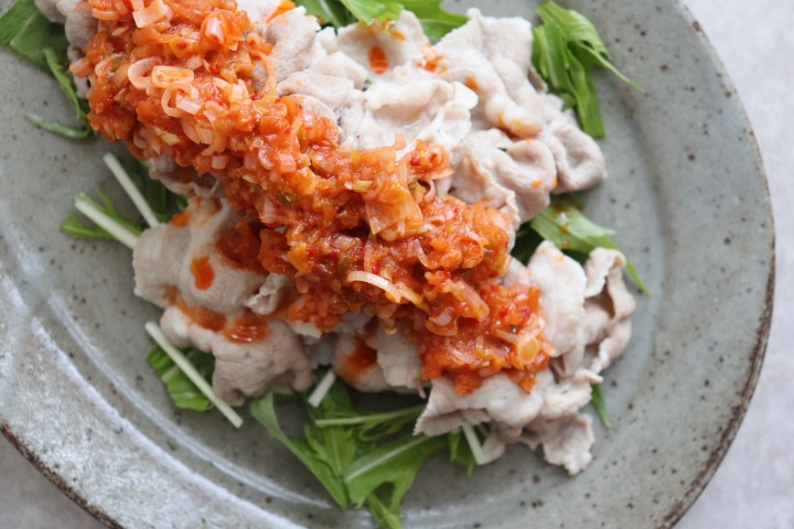 豚肉とキムチは相性抜群。しゃぶしゃぶ用の薄切り肉をさっと火を通し、生野菜と一緒に特製キムチだれでいただきます。