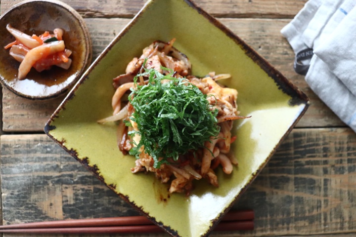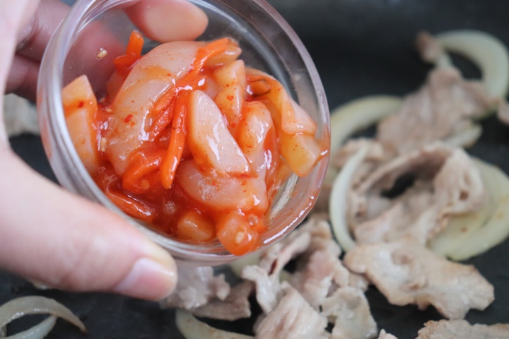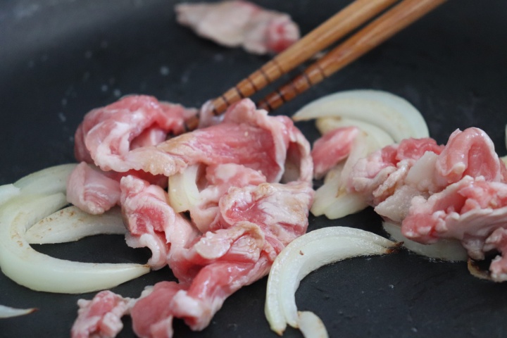 一旦取り出し、再度油(残り)を引いてくし切りにした玉ねぎ、豚こま肉を炒める