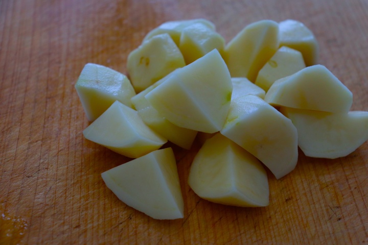 新じゃがいもは皮をむき、食べやすい大きさに切る。水にさらしてザルにあげる