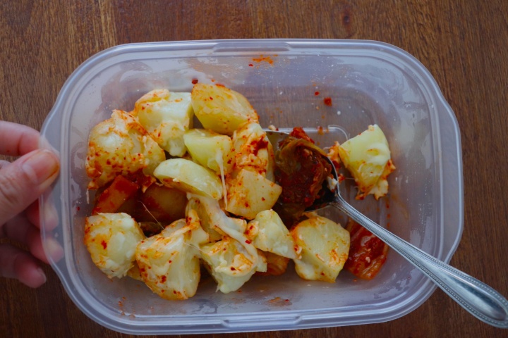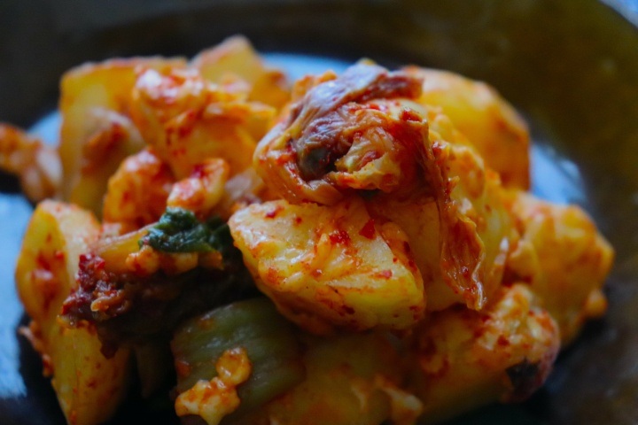 新じゃががおいしい季節です。そんなほくほくの新ジャガにキムチを加えて栄養をプラス。