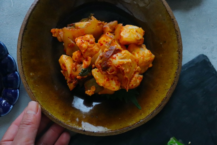 触れるくらいに粗熱が取れたら、白菜キムチを加えて全体を優しく和える