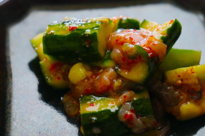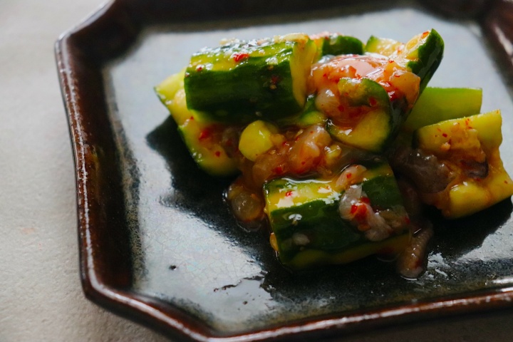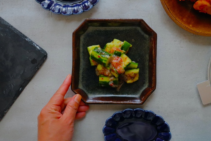 叩くことで断面に味が入り込みやすくなり、タコキムチの味が染みて旨味が広がります。