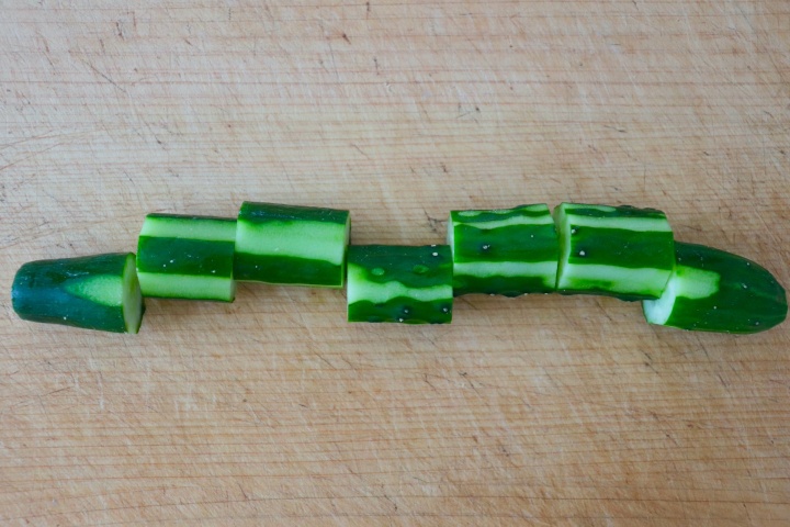 きゅうりは洗って縦にピーラーで皮をむく(3〜4箇所)