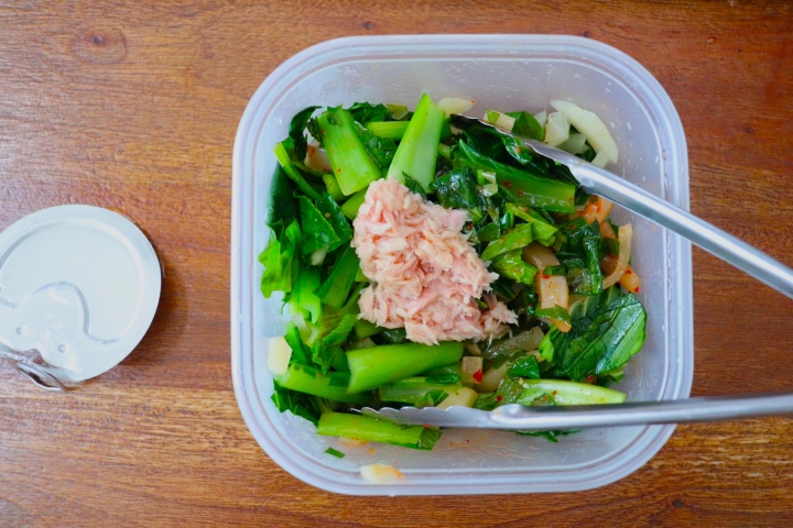 2とイカキムチ、そしてツナ缶を加えて全体を和える。