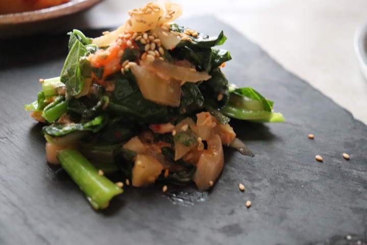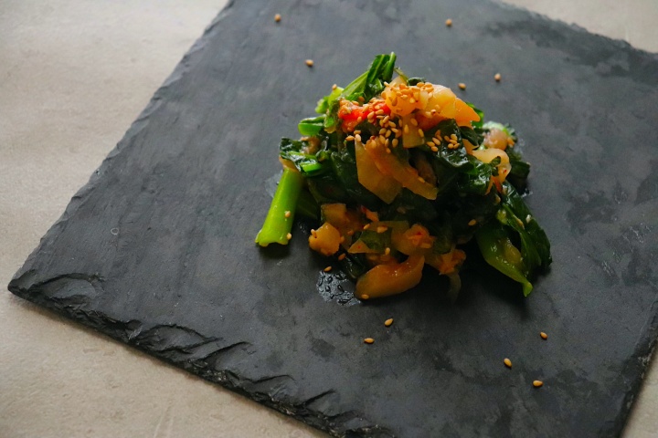 旨味がぎゅっと詰まったキムチを、そのまま調味料として活用してしまうこちらのレシピ。体のために積極的に摂り入れたい野菜もモリモリ食べられます。小松菜のシャキシャキした食感と沢庵のコリコリ感。そしてイカキムチのムニッと食感をアクセントに。