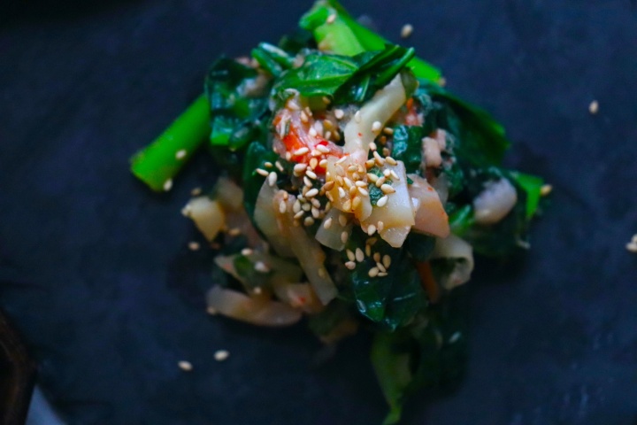 お皿に盛り付け、仕上げにいりごまをふりかけて出来上がり。