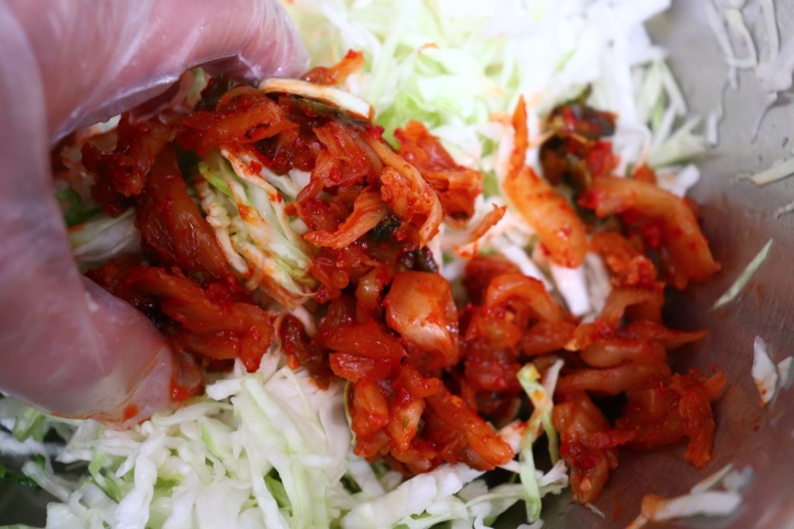 刻んだキムチと胡麻油・いりごまを加えてよく和える。
