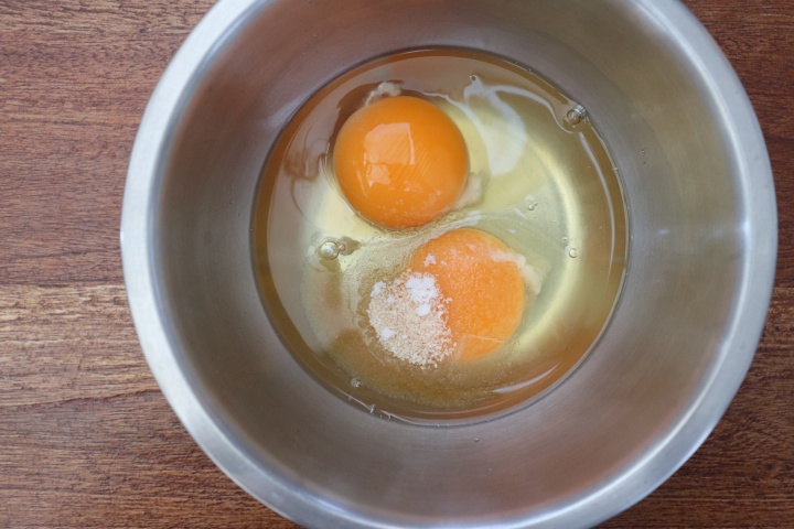 卵は溶きほぐし、砂糖・塩を加えてよく混ぜる。