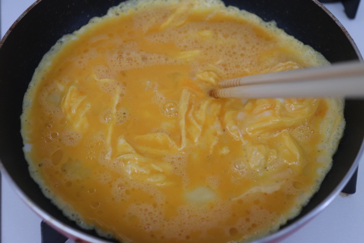フライパン(20cm)に油を敷いて熱し、1を一気に加える。菜箸で大きく混ぜる。