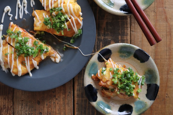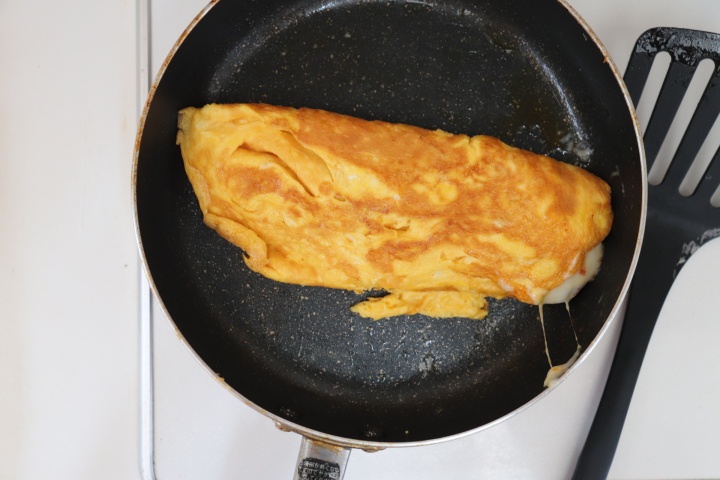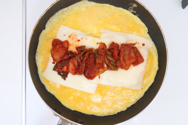 チーズをしっかり溶かしたらあとは卵で包みます。キムチを入れる前に火を止めて包み上げるのがポイントですよ。
