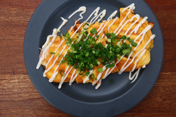 包丁で切り分け、仕上げにマヨネーズと小口切りにした青ネギを散らす。