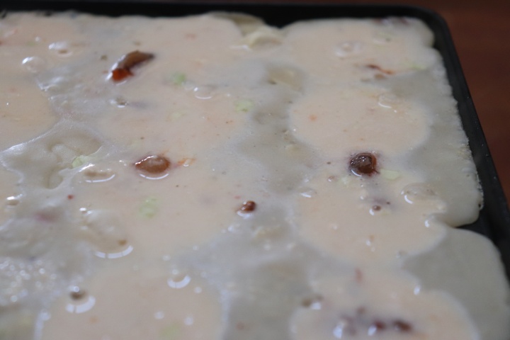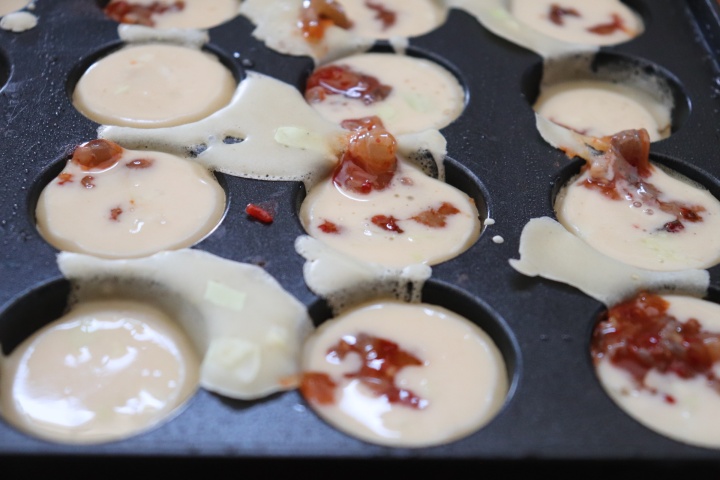 たこキムチを入れたら、もう一度生地をたっぷり流し入れる。