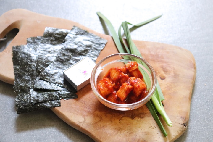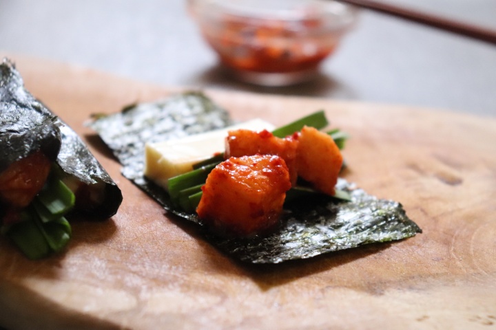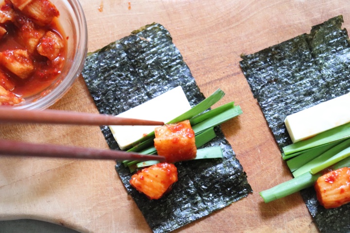 海苔の上に、半分に切ったベビーチーズとニラ、山芋キムチをのせる。
