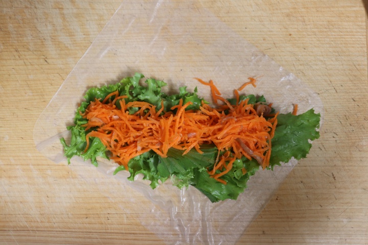 ライスペーパーを広げ、レタスと生野菜、山芋キムチを中央にのせる。