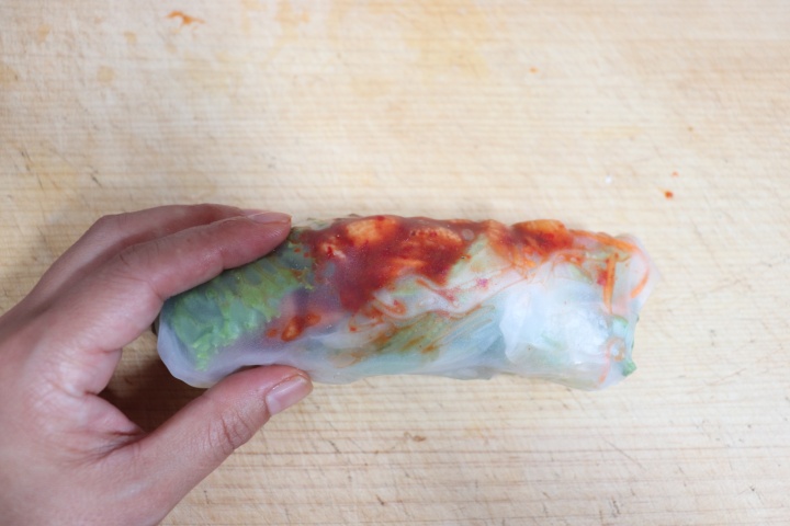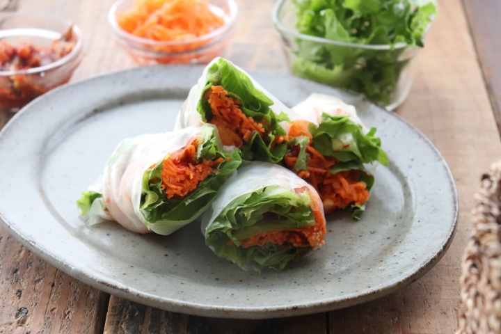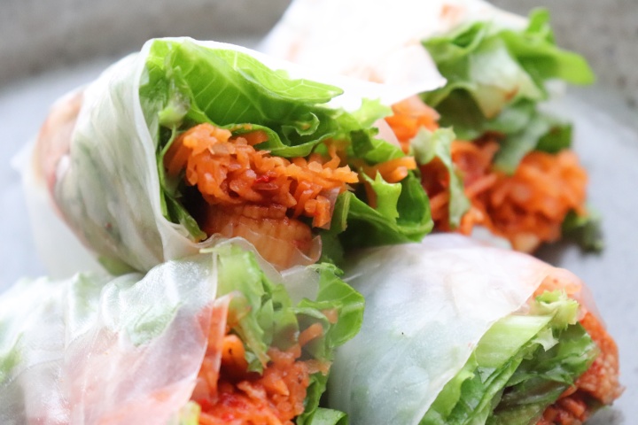 食欲がない日でも、パクパクっと食べられてしまう生春巻き。キムチの味付けのおかげで、たれは別添えで用意する必要はありません。