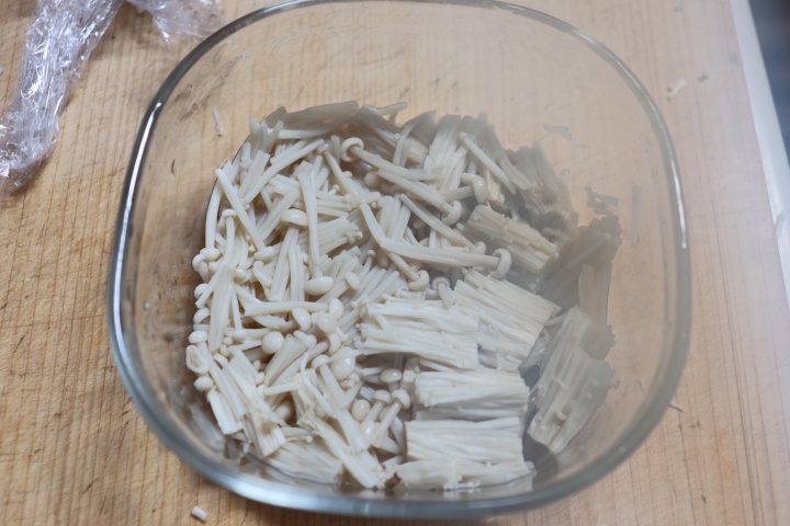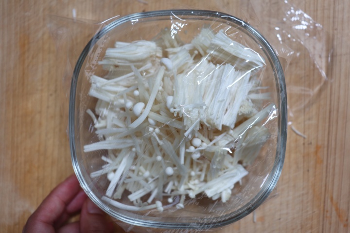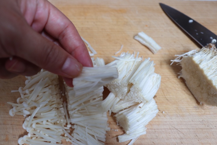 えのきは下の部分を切り、食べやすい大きさに切る。