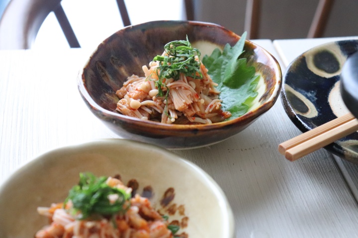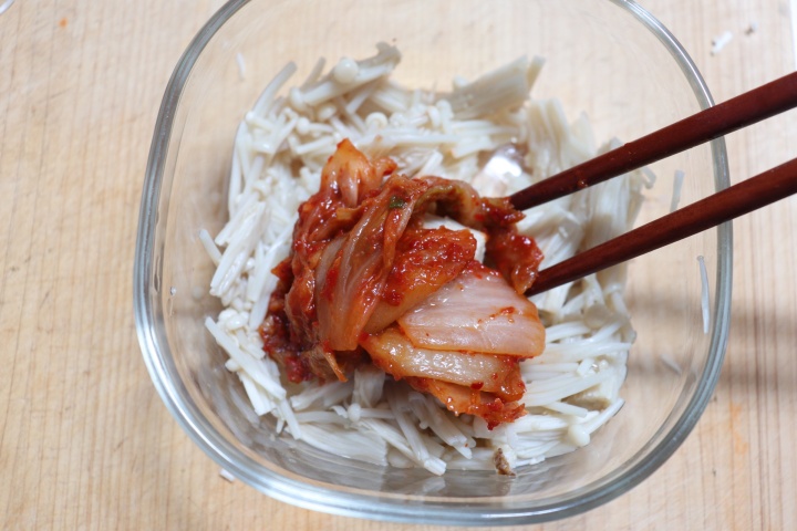 えのきとキムチを合わせて簡単なめたけキムチに仕上げます。キムチのもつ乳酸菌をそのままいただくために、冷めてから合わせてくださいね。