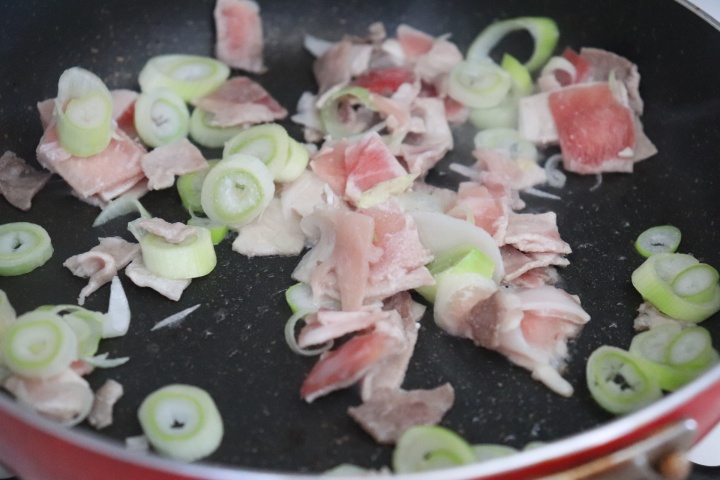 フライパンに油を熱し、ねぎと豚小間肉を火が通るまで炒め、塩を振る。