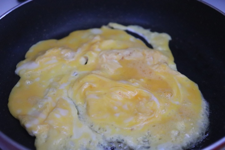 フライパンに油を熱し、よく混ぜた(A)を一気に流し入れ、菜箸で大きく混ぜたら火を止める。