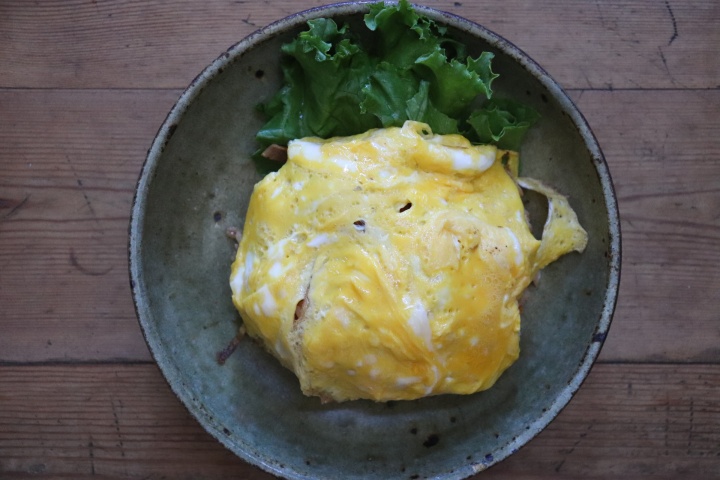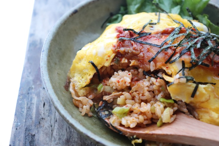 全てをフライパンで炒めずに作るオムライス。キムチは加熱せずに混ぜ込むだけなので、キムチの持つ乳酸菌をそのままいただけます。