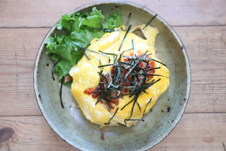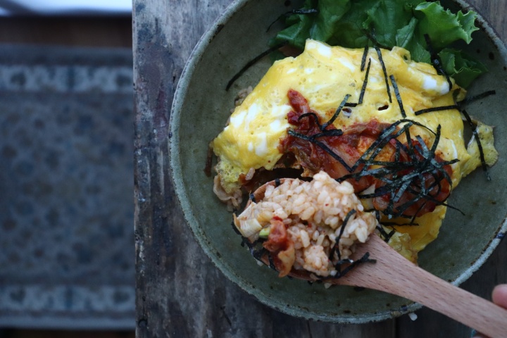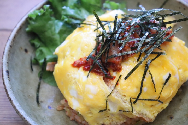 追いキムチものせて、キムチ好きにはたまらないオムライスに仕立てます。