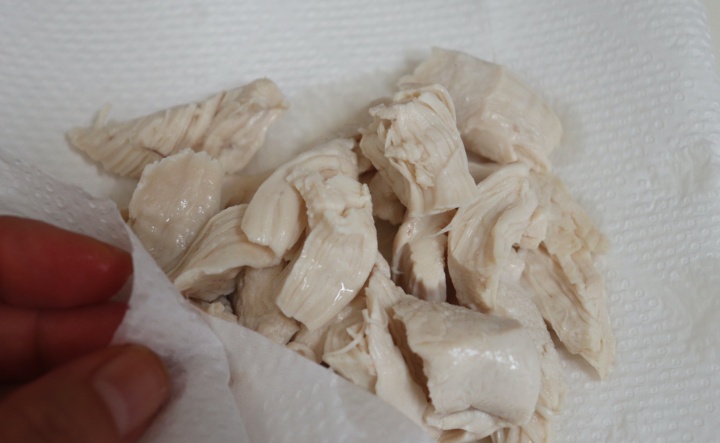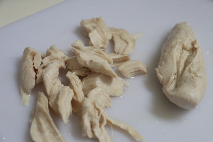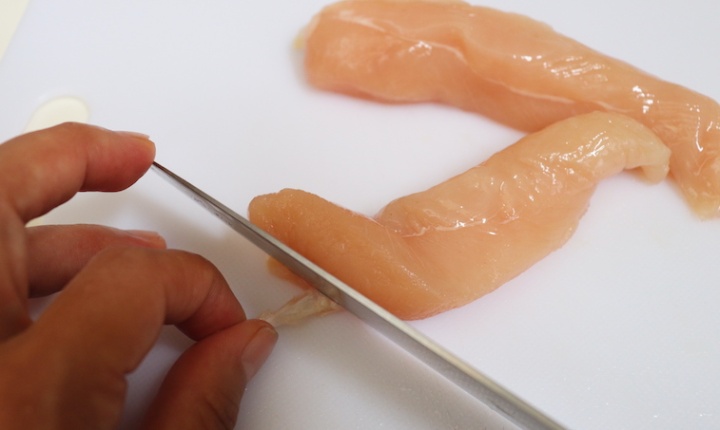 ささみは筋取りをする。筋の両端に切り込みを入れたら裏返し、削ぐように包丁を動かしていき、筋を取る。