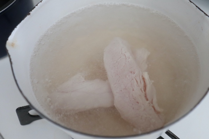 鍋にささみがかぶる位の水を加えて、塩、酒を加えて火にかける。