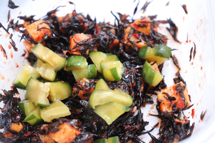 1.ひじきは水に戻し、600Wの電子レンジで2分加熱する。きゅうりの漬物は食べやすい大きさに切る