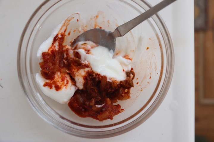 白菜キムチは細かく刻み、ヨーグルト、醤油とよく混ぜる。