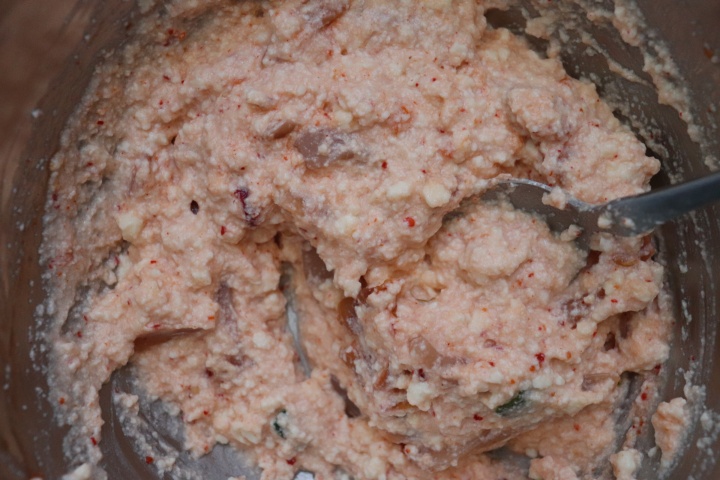 絹豆腐、片栗粉、いかキムチをボウルに入れて、よく混ぜる。