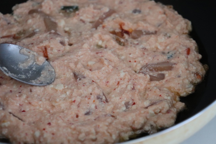 フライパンに胡麻油を敷いて熱し、生地を入れて丸く薄く整える。