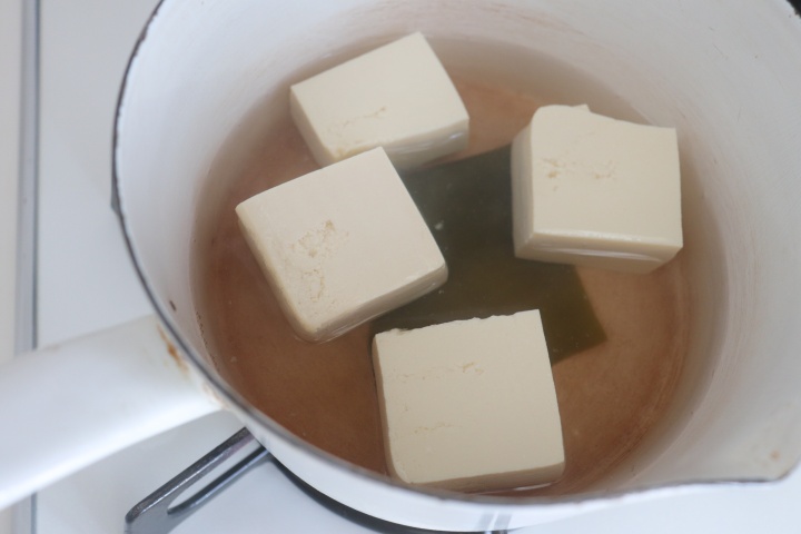 木綿豆腐と塩ひとつまみ(分量外)を1に入れて火にかける。