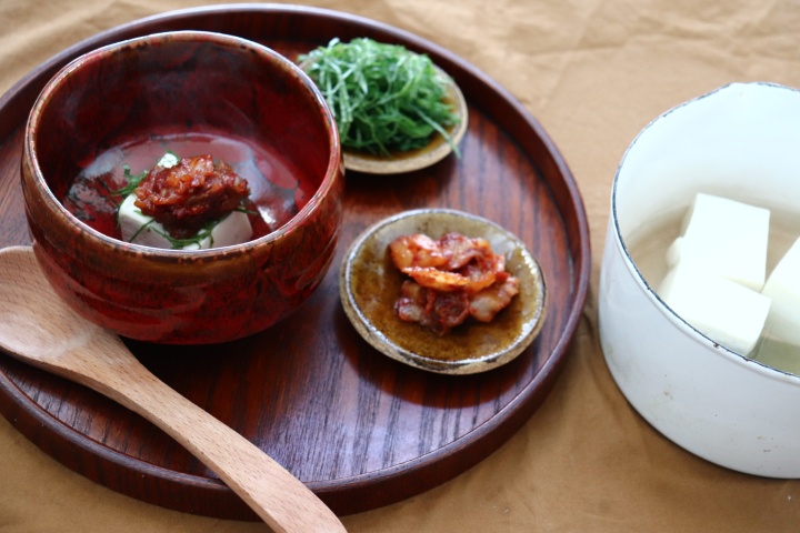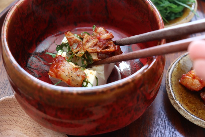 温かい豆腐を救って器にもり、キムチと刻んだ大葉、お好みで醤油をかけていただく