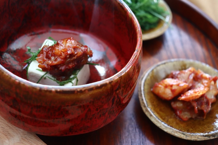 熱々のお豆腐に薬味とキムチをのせていただきましょう。