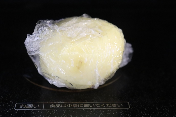 じゃがいもは皮をむき、ラップで包んで600Wの電子レンジで4分加熱→ひっくり返して2分加熱する。