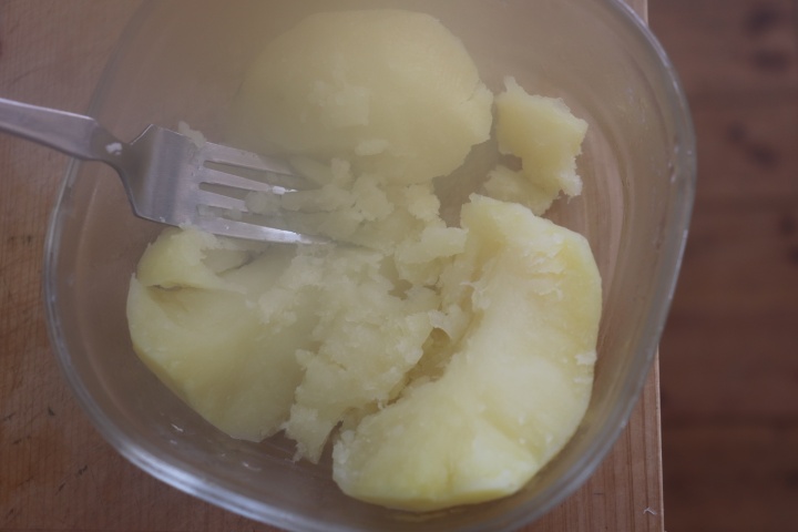 1に火が通ったことを確認し、耐熱さらに入れて軽く潰す。