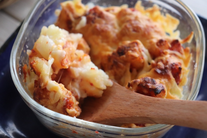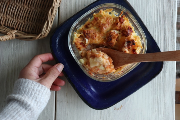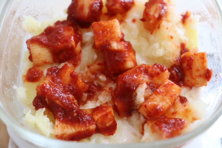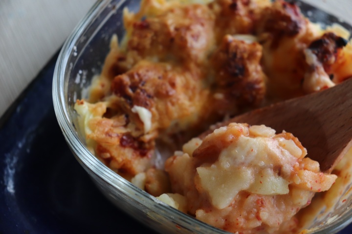 牛乳を加え、じゃがいもの上に山芋キムチ、ピザ用チーズを順に乗せる。