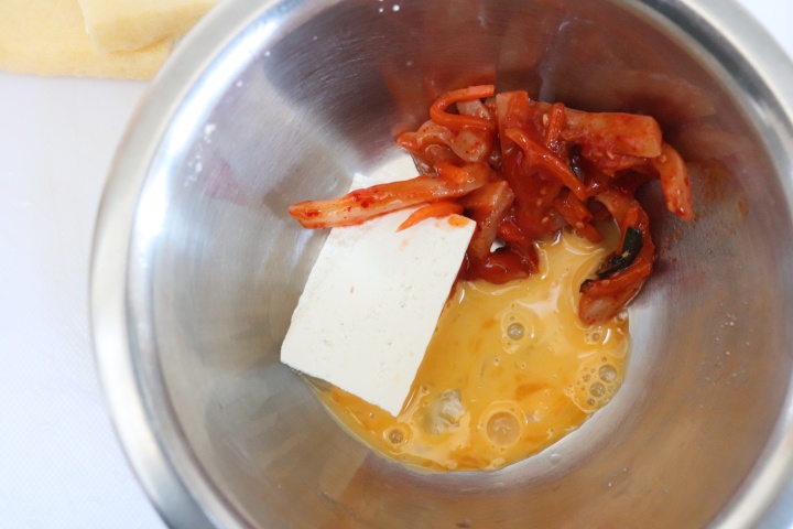 木綿豆腐、卵、いかキムチをよく混ぜておく。