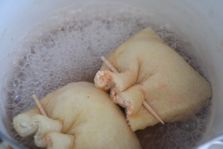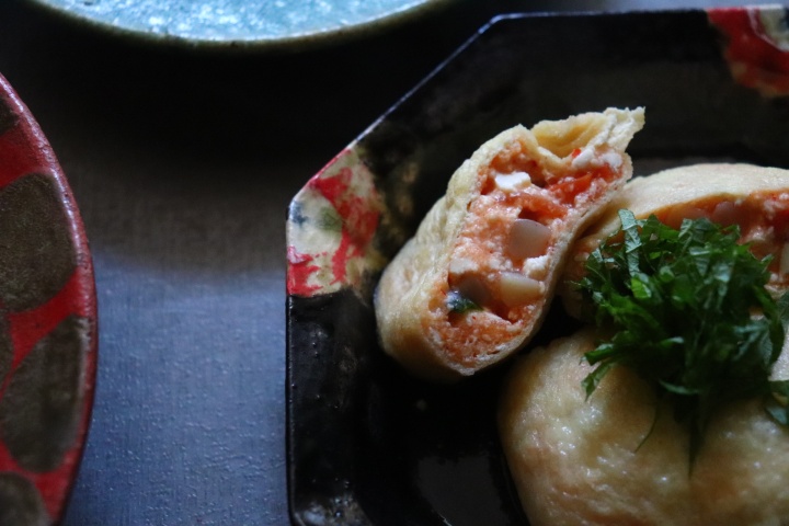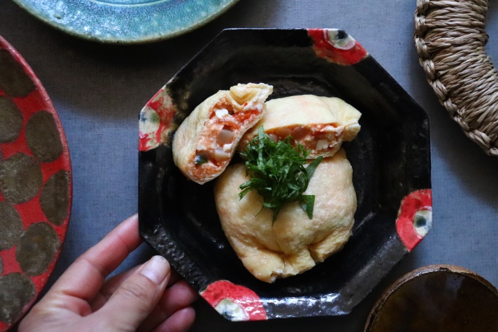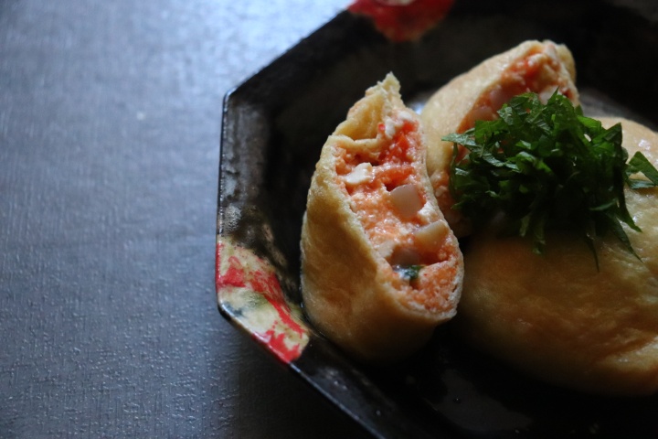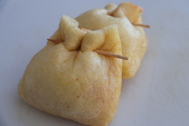 1の油揚げの巾着の中に2の具材を詰めて、爪楊枝で口を閉じる。