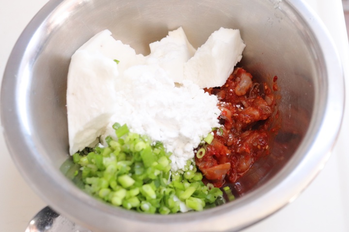 ボウルにたこキムチ、小口切りにした青ネギ、手でちぎったはんぺん、片栗粉を加えてよく混ぜる。